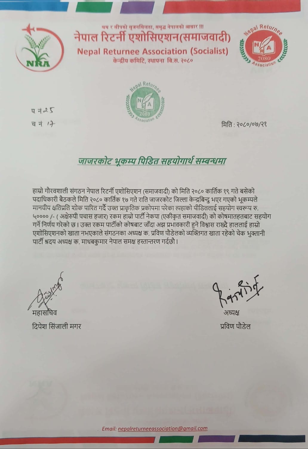 386877460_350749934293549_2127375074066380926_n Post navigation Previous: भुकम्प पीडितका लागि नेपाल रिटर्नी एसोसिएसनको ५० हजार सहयोग। बिस्व समुदायलाई सहयोग र समर्थनका लागि अपिल Leave a ReplyYour email address will not be published. Required fields are marked *Comment * Name Email Website