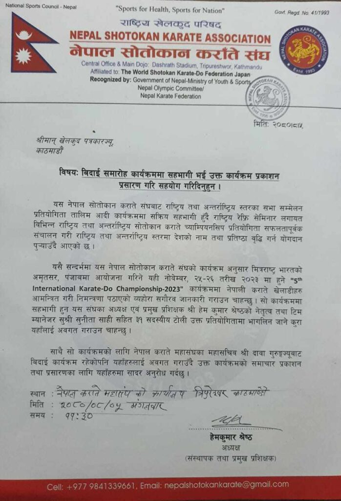 इन्डियाको पन्जाब राज्यको अमृतसरमा २०२३ नोभेम्बर २५ देखि २६ सम्म हुने 5th Internationa Karate -Do Championship २०२३ कार्यक्रम लागि नेपाली खेलाडीहरुको टोलि त्यस तर्फ लागेको छ । नेपाल सोतोकान काराते संघका अध्यक्ष एबम प्रमुख प्रशिक्षक हेम कुमार श्रेष्ठको नेतृत्वमा टिम म्यानेजर सुनिता शाही सहित ३१ सदस्यी टोलि मंसिर ५ गते इन्डिया प्रस्थान गरेको हो।
