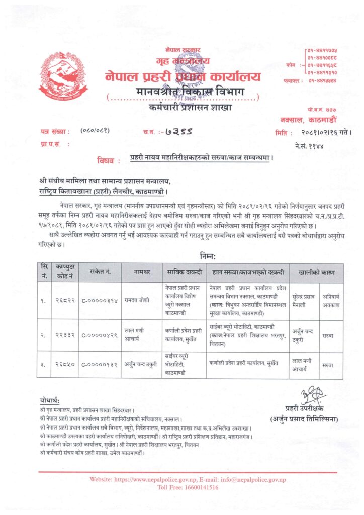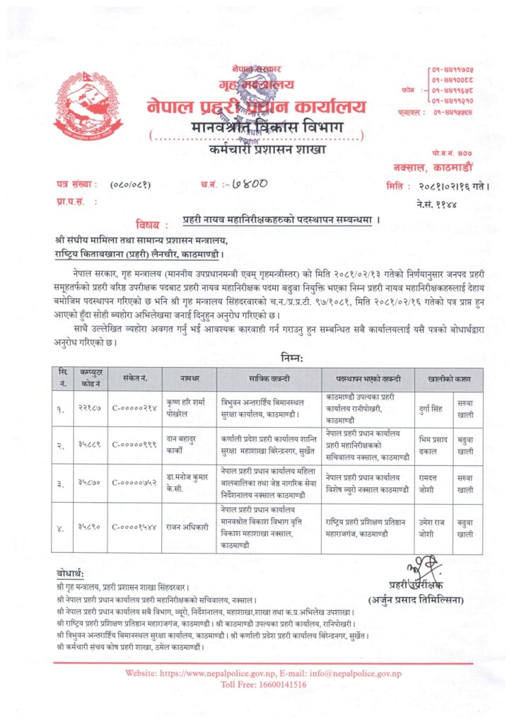 जनपद प्रहरी समूहतर्फको प्रहरी नायव महानिरीक्षक (DIG) हरुको पदस्थापन सम्बन्धमा (मिति २०८१।०२।१६ गते) कालो किताब May 30, 2024 1 minute read रबि लामिछाने गृहमन्त्री भएपछि जनपद प्रहरी समूहतर्फको प्रहरी नायव महानिरीक्षक (DIG) हरुको पदस्थापन सम्बन्धमा (मिति २०८१।०२।१६ गते) About The Author कालो किताब कालो किताब ब्युरो See author's posts Post navigation Previous: रबि लामिछाने गृहमन्त्री भएपछि २० जनपद प्रहरी समूहतर्फको प्रहरी वरिष्ठ उपरीक्षक (ssp) हरुको सरुवा/काज सम्बन्धमा (मिति २०८१।०२।१६ गते)Next: गृहमन्त्री रबि लामिछानेका निर्णयहरु , कुन-कुन सिडियोहरु कहाँ-कहाँ सरुवा भए ? Leave a ReplyYour email address will not be published. Required fields are marked *Comment * Name Email Website Related Stories तीन जनाको जग्गा दानपछि ११ वर्षमा आफ्नै जमिनमा सर्दै गल्छी–४ को वडा कार्यालय कालो किताब April 16, 2026 0 डा बाबुराम भट्टराईलाई भारतबाट प्रमुख बक्ताका रुपमा निम्त्याईयो कालो किताब April 11, 2026 0 बालेन्द्र शाह सरकारलाई ईतिहास रच्ने यस्ता अबसर कालो किताब April 10, 2026 0