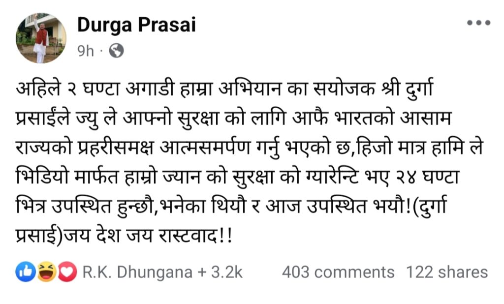 दुर्गा प्रसाईं, नेपालमा राजतन्त्र र हिन्दू राष्ट्रको पुनर्स्थापनाको पक्षधर बिबादित अभियान्ता हुन । उनै भारतको असाममा पक्राउ परे भनेर उनिहरुले नै झुटो अफवाह प्रचारमा ल्याए, समाचारका हेडलाईनहरु बनाईए ।