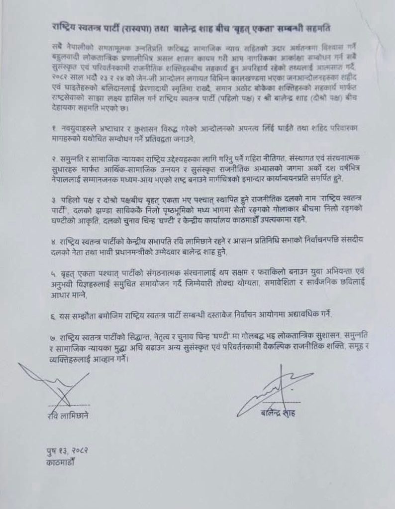 लामो कसरतपछि राष्ट्रिय स्वतन्त्र पार्टी (रास्वपा) र काठमाडौँ महानगरपालिकाका मेयर बालेन शाहबीच मध्यारातमा भएको ७ बुँदे सहमतिअनुसार रवि पार्टी सभापति र बालेन प्रधानमन्त्रीका उम्मेदवार हुनुहुनेछन्।
